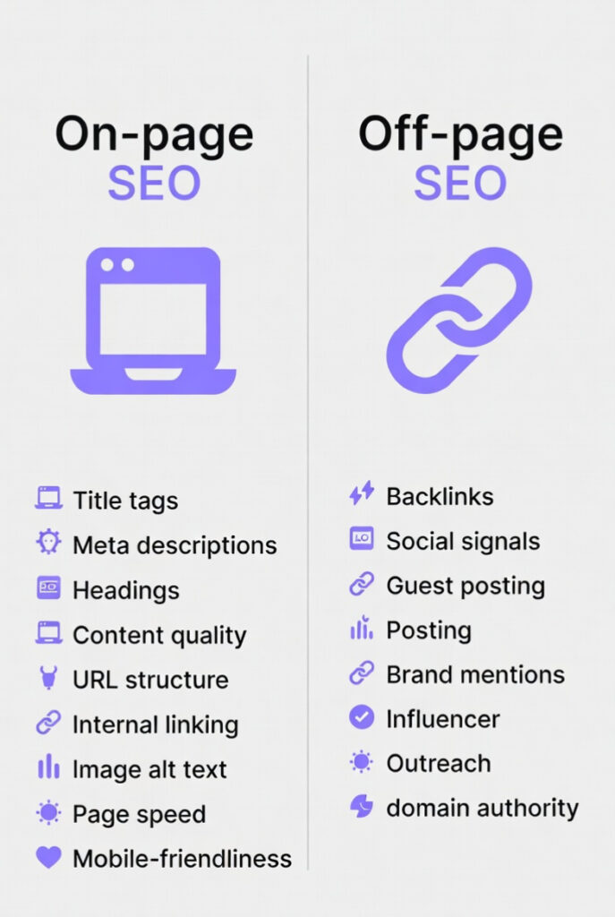 On-page SEO is everything you have total control over. It’s the stuff on your server. You decide the keywords, you write the content, you fix the page speed, and you structure the internal links . It’s about making your site relevant and user-friendly.